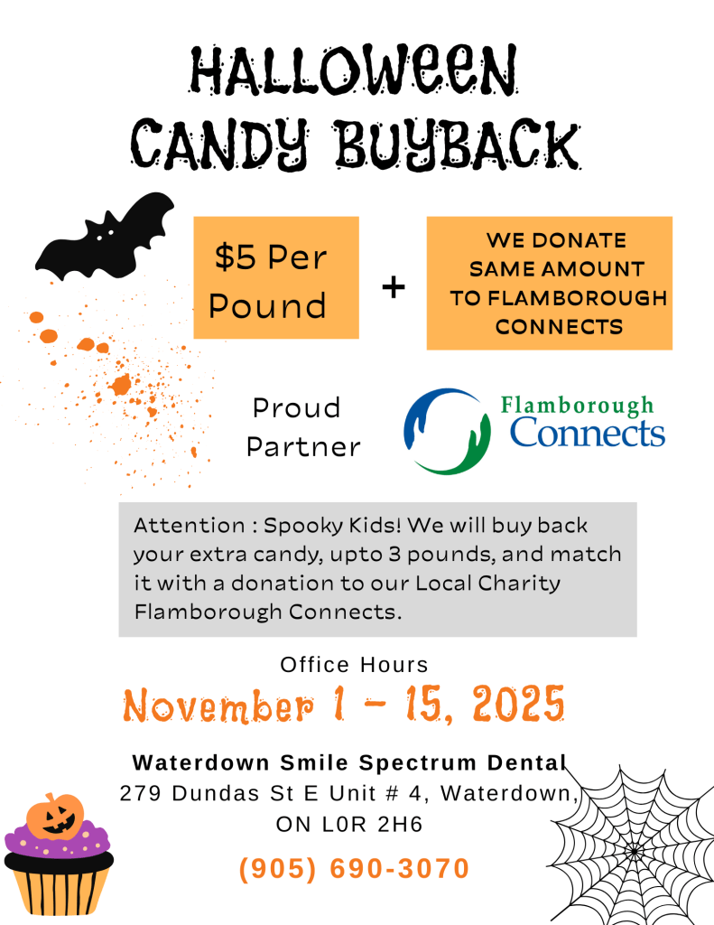 Waterdown, ON – Waterdown Smile Spectrum Dental is thrilled to announce its partnership with Flamborough Connects for this year’s Halloween Candy Buy-Back initiative, turning leftover Halloween treats into meaningful community support.